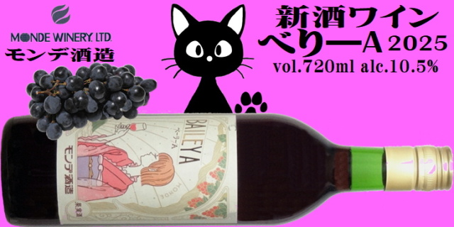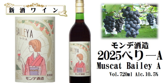 モンデ酒造 2025べりーA 720ml 山梨県出身デザイナー、オビワンさんデザインラベル 品目:果実酒 原材料名:ぶどう(山梨県産マスカットベーリーA)/酸化防止剤(亜硫酸塩) アルコール分:10.5% 内容量:720ml タイプ:中口