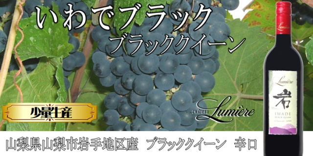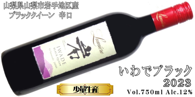品目:果実酒 原材料名:ぶどう(山梨県山梨市岩手地区産 ブラッククイーン)/酸化防止剤(亜硫酸塩) アルコール分:12% 内容量:750ml タイプ:ミディアムボディ・辛口